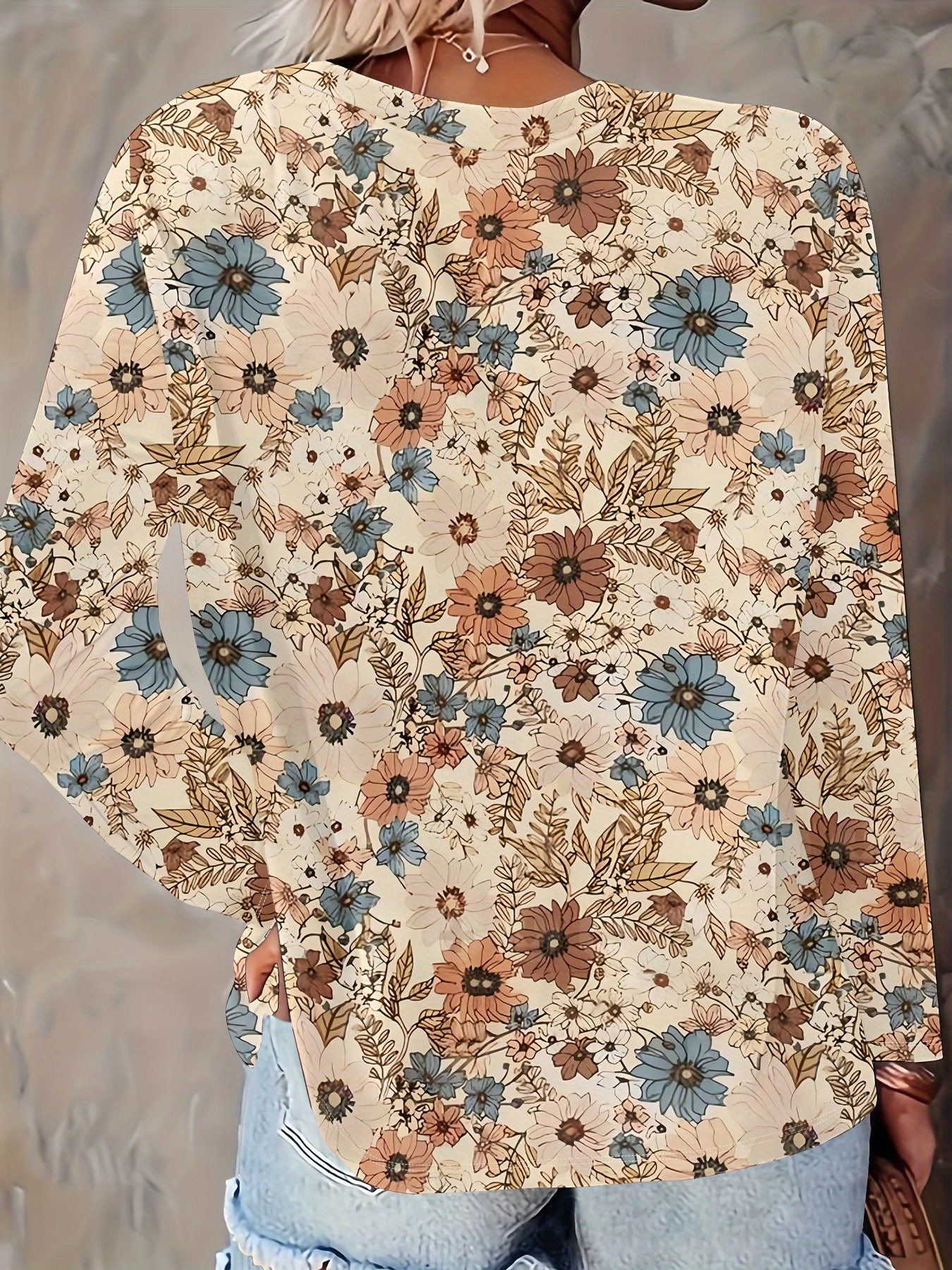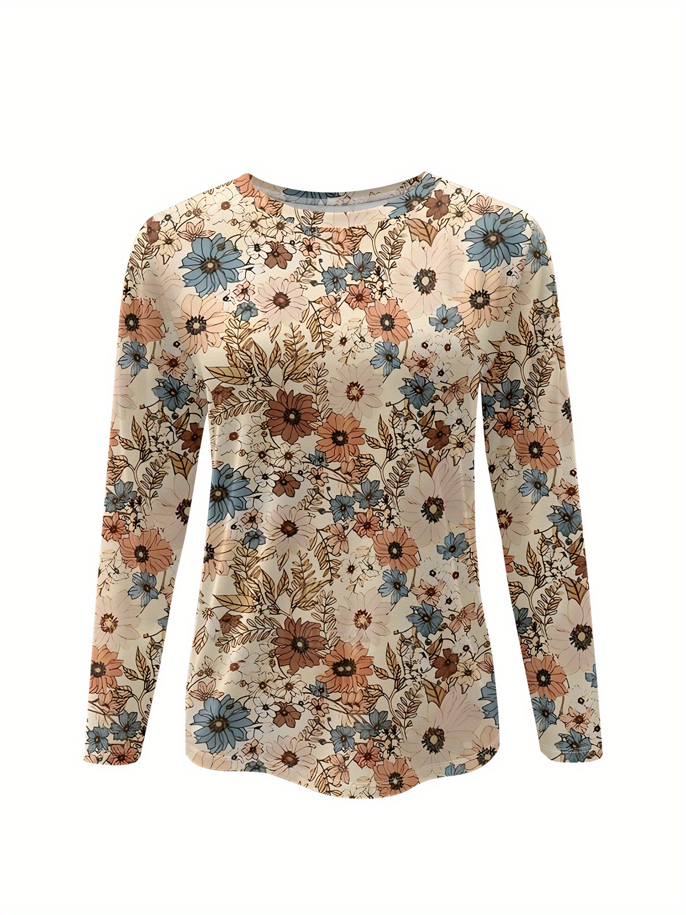 [Elegant Floral Blouse] Plus Size Women's Elegant Long Sleeve Floral T-Shirt | Fall/Winter Tops, Beige/Blue/Brown, Machine Washable, Versatile for Everyday & Formal Outfits - Classic Design, Durable, Professional Blouse