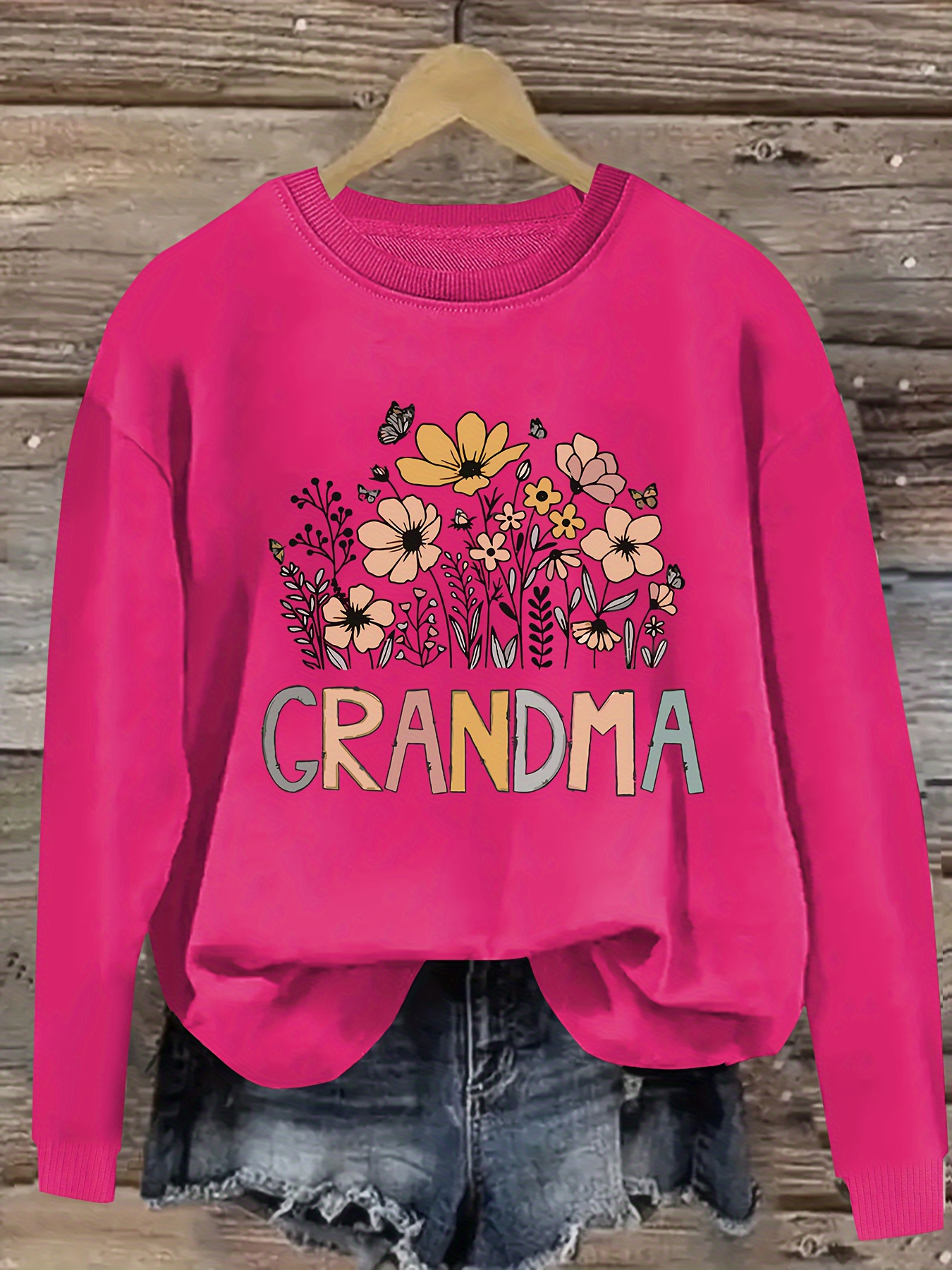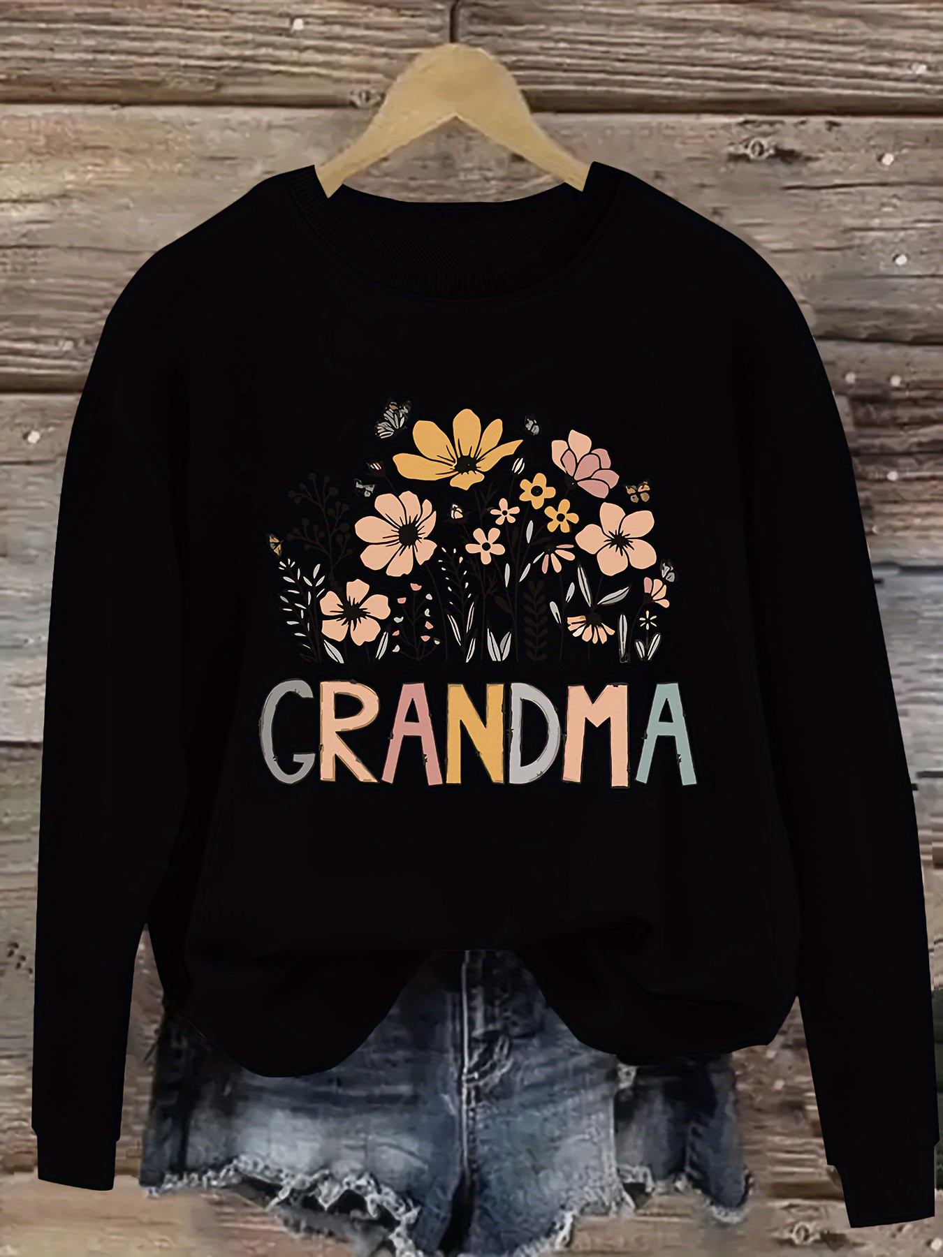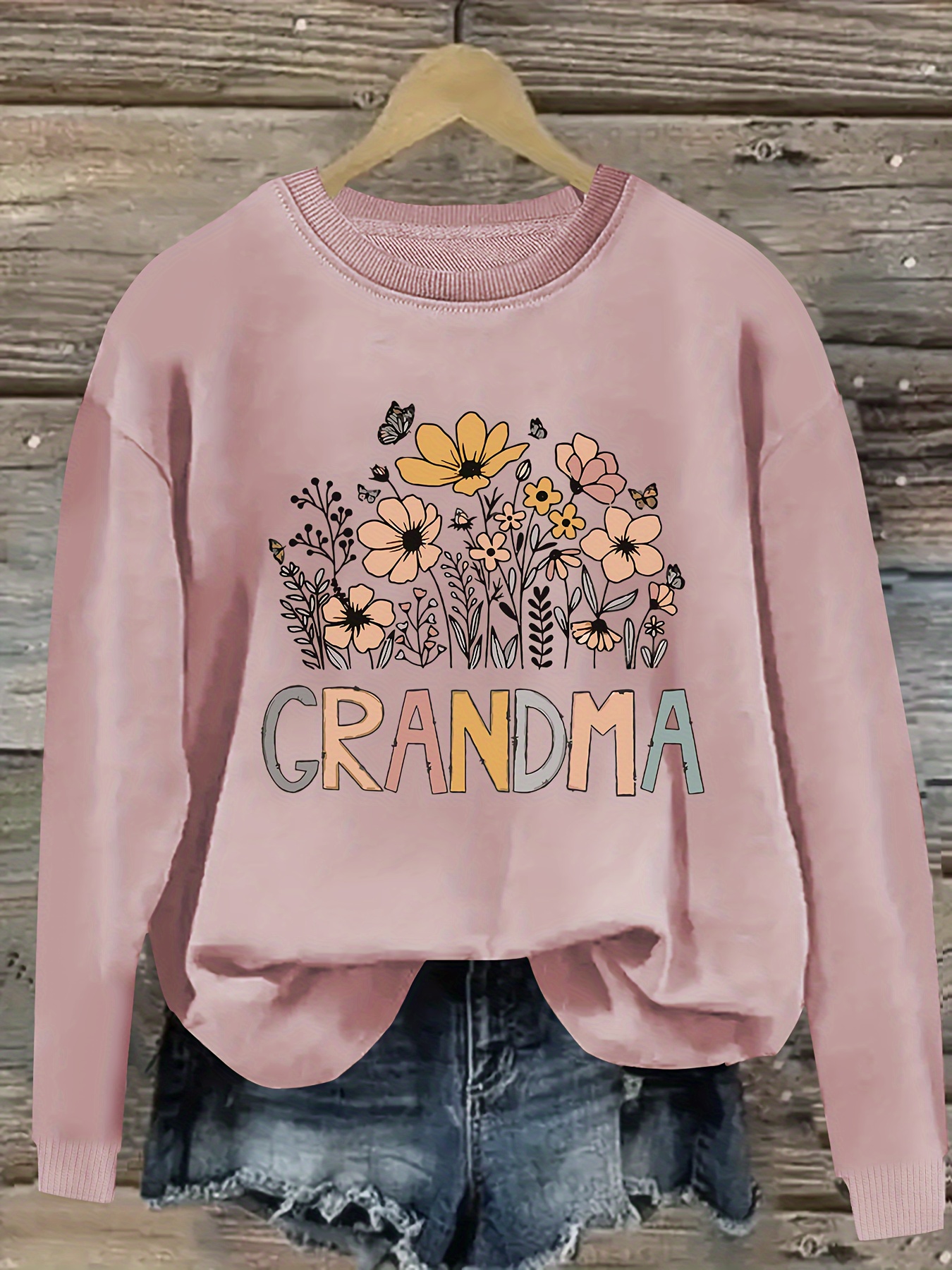 [Polyester Floral Grandma Sweatshirt] Polyester 100% Floral Grandma Graphic Pullover Sweatshirt - Plus Size, Crew Neck, Slight Stretch, Casual Sportswear for Fall/Winter - 260g/m²