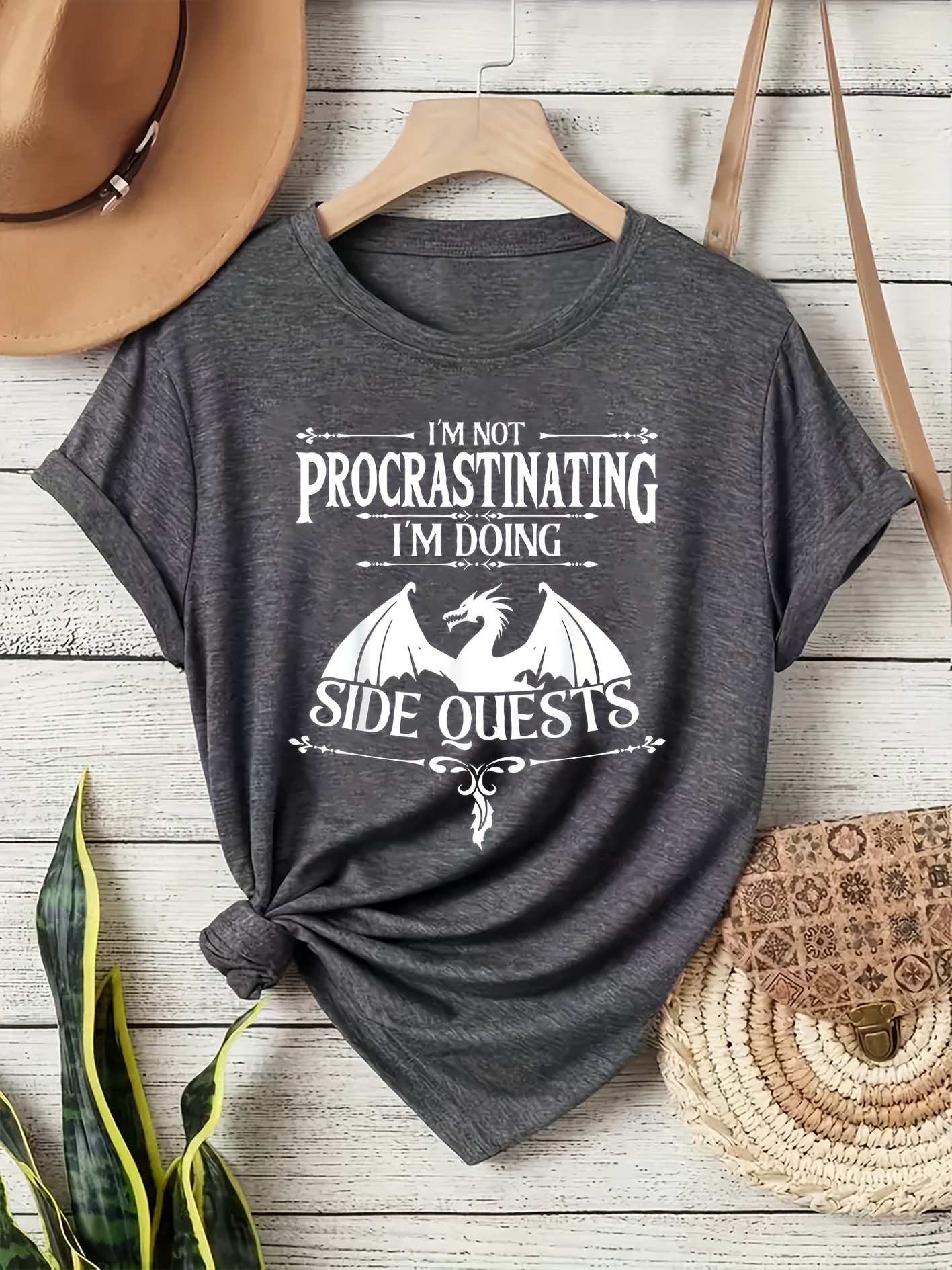 Women's Retro Graphic T-Shirt - "I'm Not Procrastinating I'm Doing Side Quests" Dragon Design, Soft Stretchy Fabric, Round Neck Short Sleeve Tee for Casual & Outdoor Wear, All-Season Comfort
