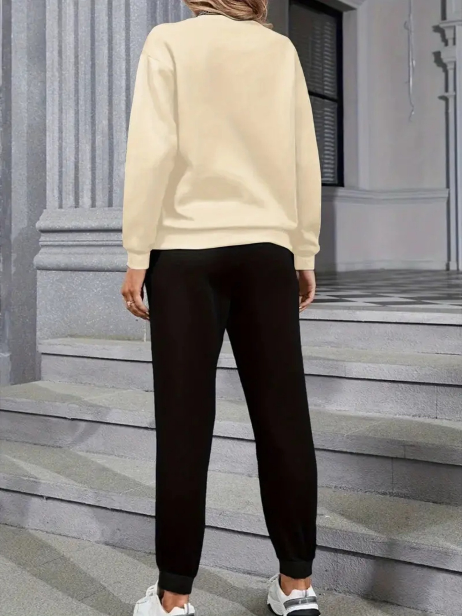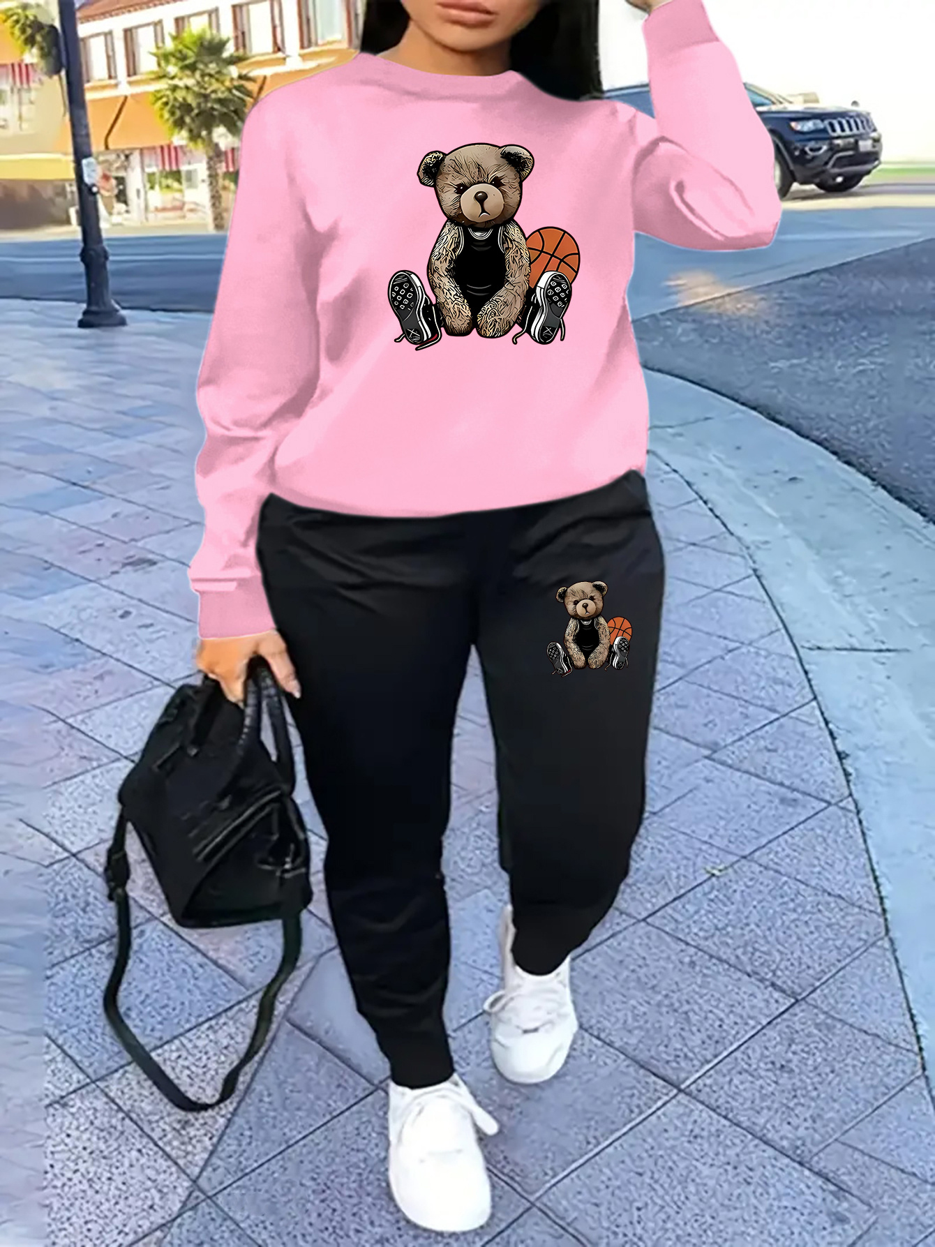 Women'S Casual Sports Fashion Bear Basketball Pattern Crew Neck Sweatshirt Set with Knit Fabric, 100% Polyester Material, Fall/Winter Season, Slight Stretch Fabric, Solid Color Pants - Athletic Loungewear Outfits